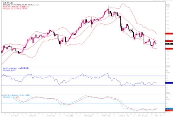 美元/日元周一(1月9日)盘整在132.68-131.31区间交投,收盘下跌0.17%。之前在美国非农就业数据公布后大跌,因押注美联储将缩减加息幅度。市场在鲍威尔周二讲话前的谨慎态度限制了美元的下行空间,美国周四将公布的通胀数据也是本周的关键,将决定美联储下次加息的幅度。此外,周二将公布的东京地区通胀数据受到关注,可能引发日本央行进一步转向鹰派的可能性。从日线图上观察,尽管美元兑日元处在布林带通道下轨,但技术指标钝化且均处于极度超卖状况中。若近期没有重大刺激因素,美元兑日元料不会产生太大的下行行情,下发关键的支撑位置在130.00,若能跌穿,美元兑日元有望向125-120的中值区域逼近。相反若久盘于130之上,则要慎防美元兑日元反弹的风险,反弹上方的阻力依次是135、137、138。