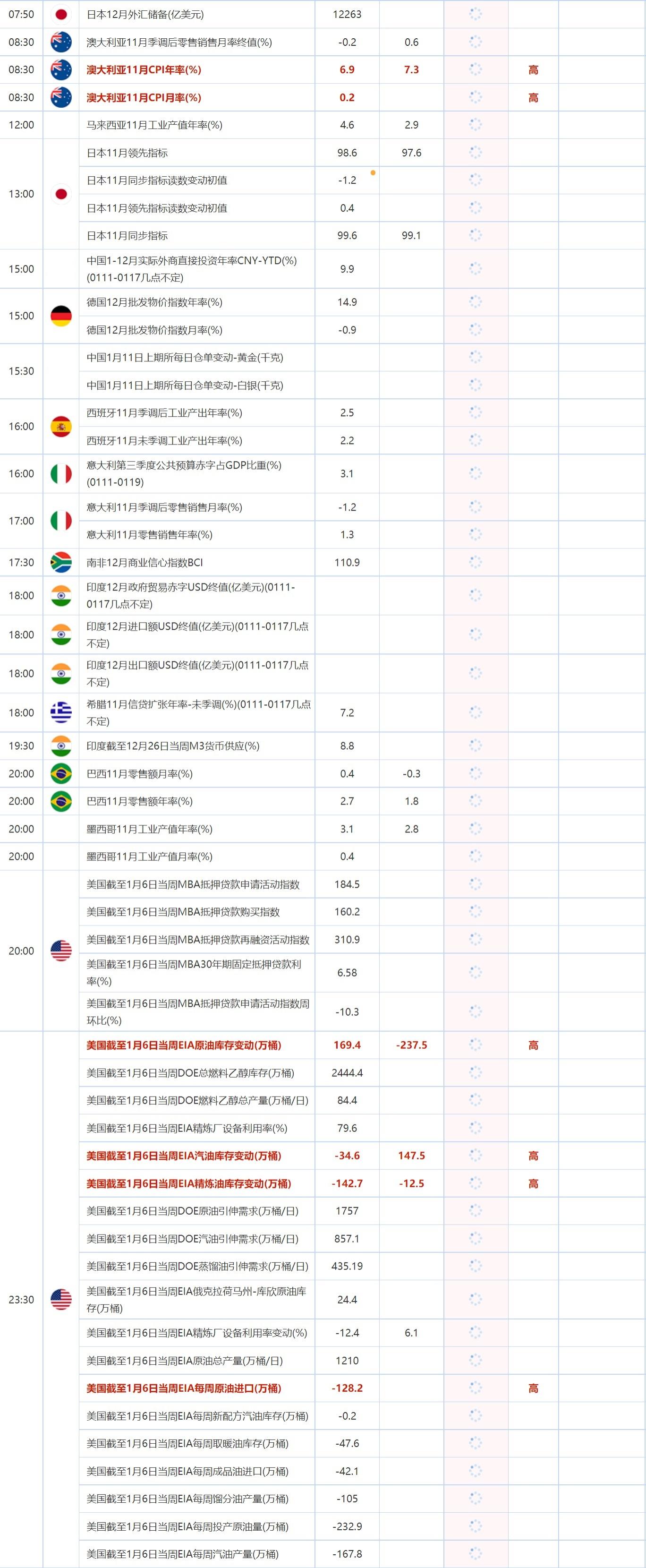 08:30 澳大利亚11月CPI年率(%) , 前值 6.9 , 预期值 7.3 , 公布值:待发布