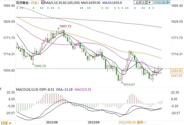 北京时间10月28日10:41,现货黄金报1664.85美元/盎司