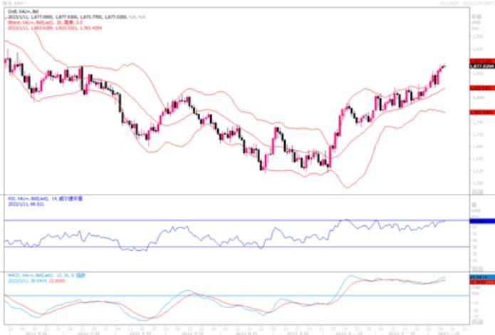 技术层面上,金价正在等待新的催化剂,以再度突破1880美元/盎司的数月高点。黄金多头的下一目标位于1900美元/盎司,若突破这一关口,这将为金价升向2022年5月高点1910美元/盎司打开大门。14日相对强弱指数(RSI)略低于超买区域,表明金价仍有更多上行空间。向上倾斜的50日移动均线已经上穿持平的200日移动均线。如果50日移动均线最终收于200日移动均线上方,将证实形成“黄金交叉”,并加强短期看涨黄金价格的倾向。另一方面,黄金卖家可能会在1880美元/盎司的水平反击,促使金价修正性回调并跌向前个交易日低点1865美元/盎司。若黄金进一步下跌,那么金价将挑战1850美元/盎司的心理位,一旦失守该位,不排除金价遭遇抛售并跌向21日移动均线1819美元/盎司水位的可能性。