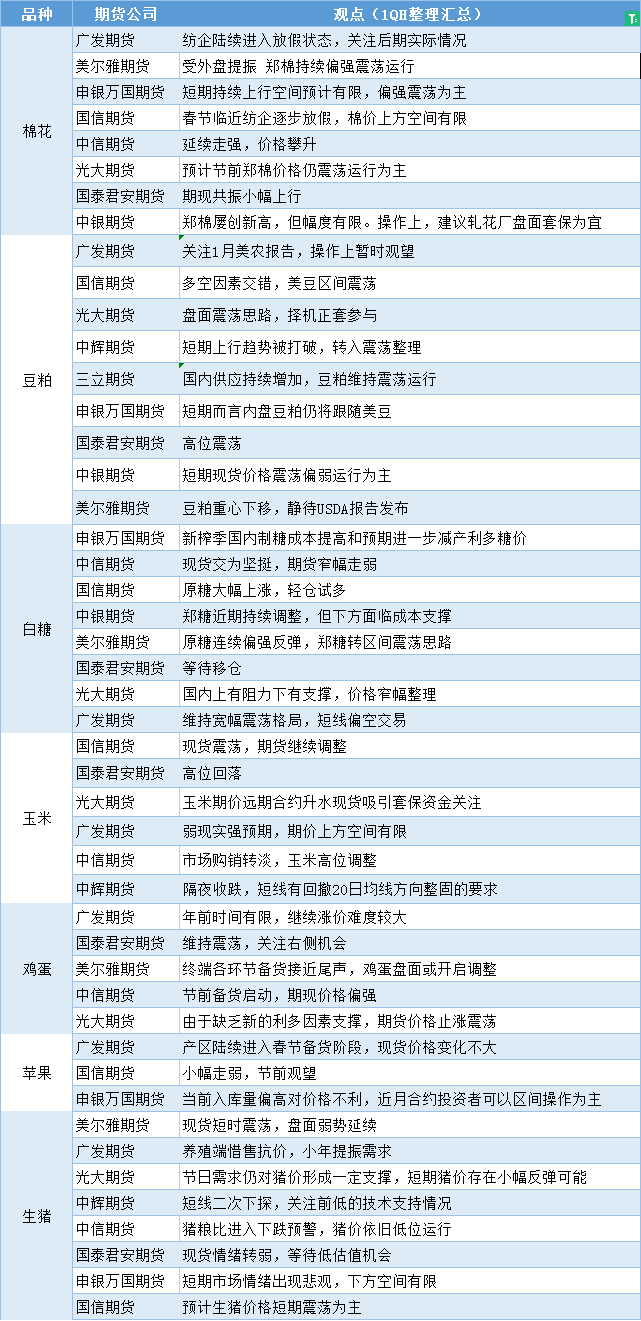 期货公司观点汇总一张图:1月11日农产品(棉花、豆粕、白糖、玉米、鸡蛋、生猪等)