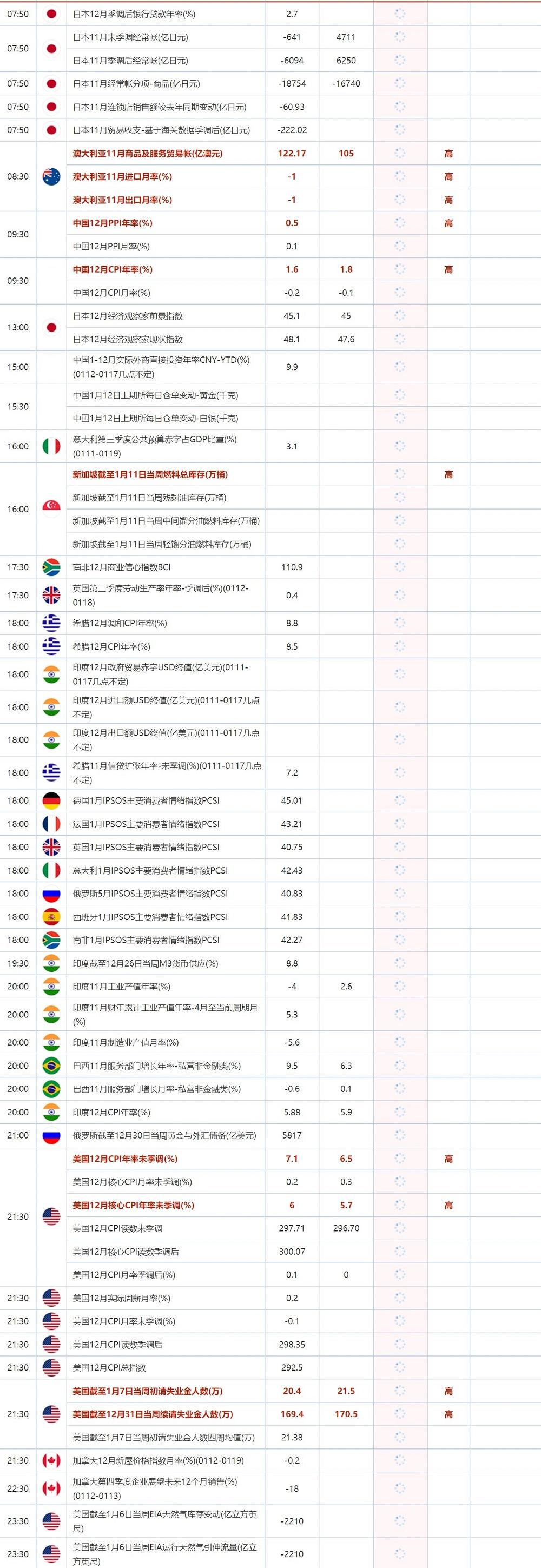21:30 美国12月CPI年率未季调(%) , 前值 7.1 , 预期值 6.5 , 公布值:待发布
