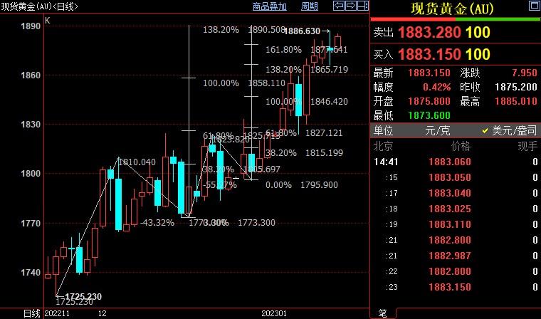 北京时间14:51,现货黄金上涨0.40%至1882.65美元/盎司;COMEX期金主力合约上涨0.36%至1885.7美元/盎司;美元指数下跌0.07%至103.161。