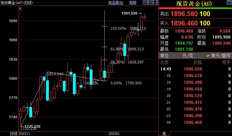 北京时间14:49,现货黄金上浮0.02%至1896.21美元/盎司;COMEX期金主力合约上浮0.03%至1899.3美元/盎司;美元指数下跌0.02%至102.226。