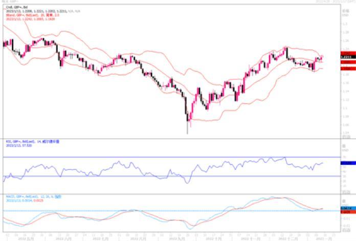 周四(1月12日)英镑兑美元上涨0.51%至1.2210,盘中曾高触1.2247。英镑昨日走升,完全拜美国12月通胀率数据继续下滑所赐,因为通胀率进一步的连续下滑,加强了投资者对于美联储将会转入平缓加息阶段的预期,为此美元出现大幅下跌,美元指数依然跌穿了近期强支撑103.00水平。日线图上,英镑兑美元汇价重回到短期均线上方,MACD技术指标重新形成金叉,RSI向超买区域延展,显示英镑多头有重新入场迹象。若近期英国方面无太大的负面消息冲击,英镑兑美元或能继续保持上行的态势。下方目前强支撑在1.2010,若镑美能保持该水平之上,后市有望攀向更高水位。