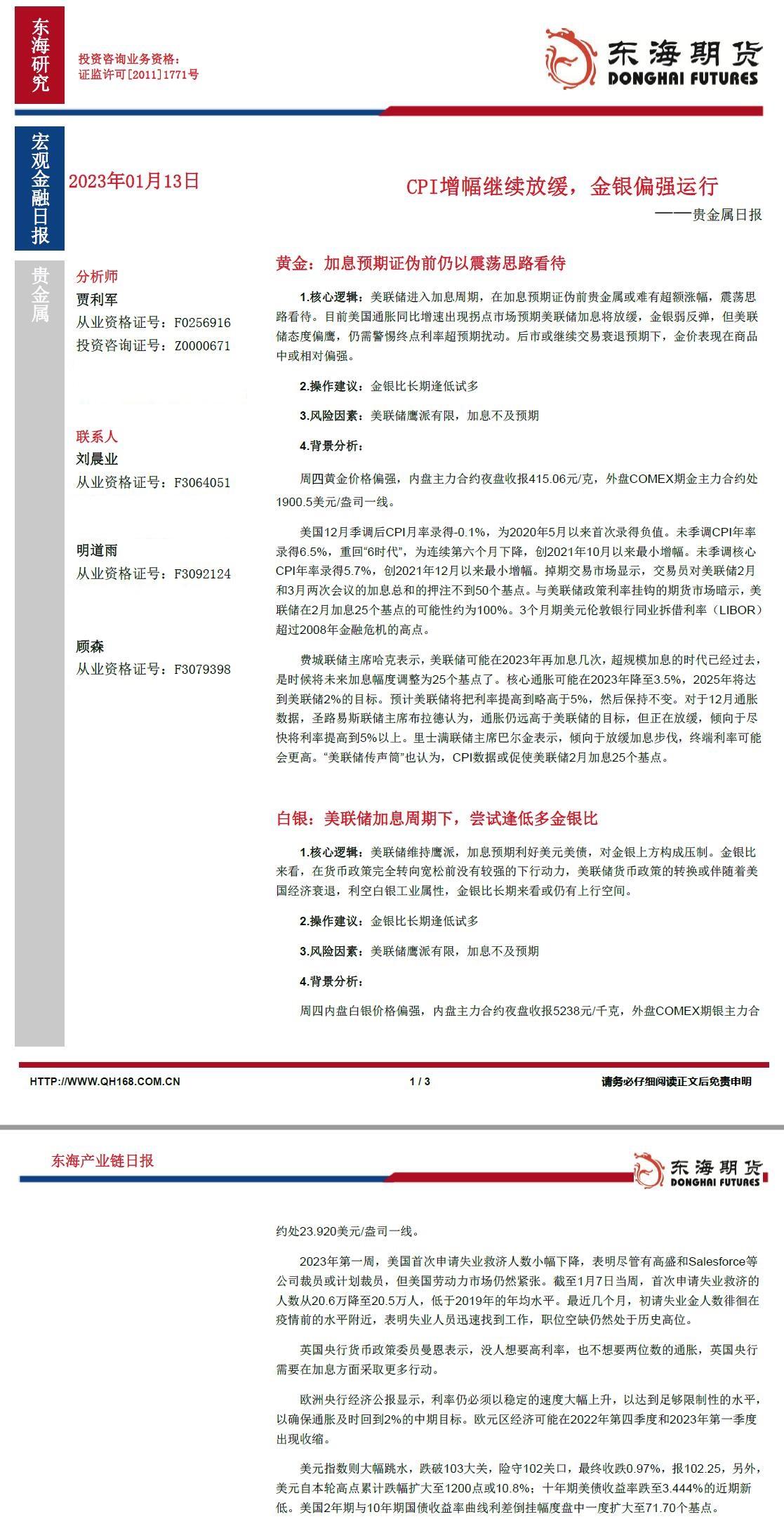 【东海期货1月13日产业链日报】贵金属篇:CPI增幅继续放缓,金银偏强运行