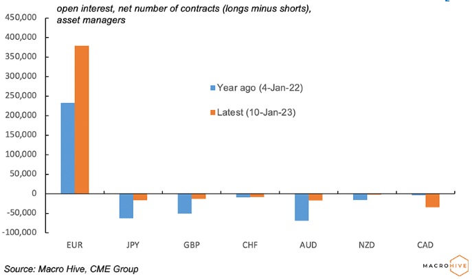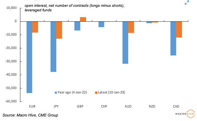 2023年年初,投资者的仓位大多低于去年同期。对冲基金看空欧元、日元、澳元和加元兑美元的汇率