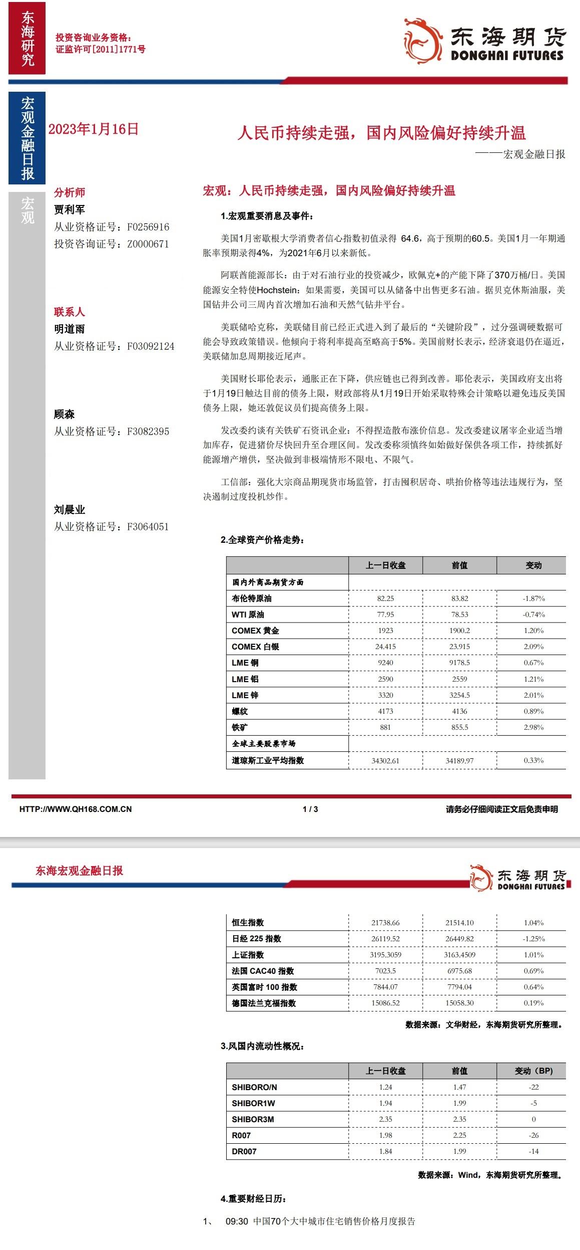 【东海期货1月16日宏观金融日报】:人民币持续走强,国内风险偏好持续升温