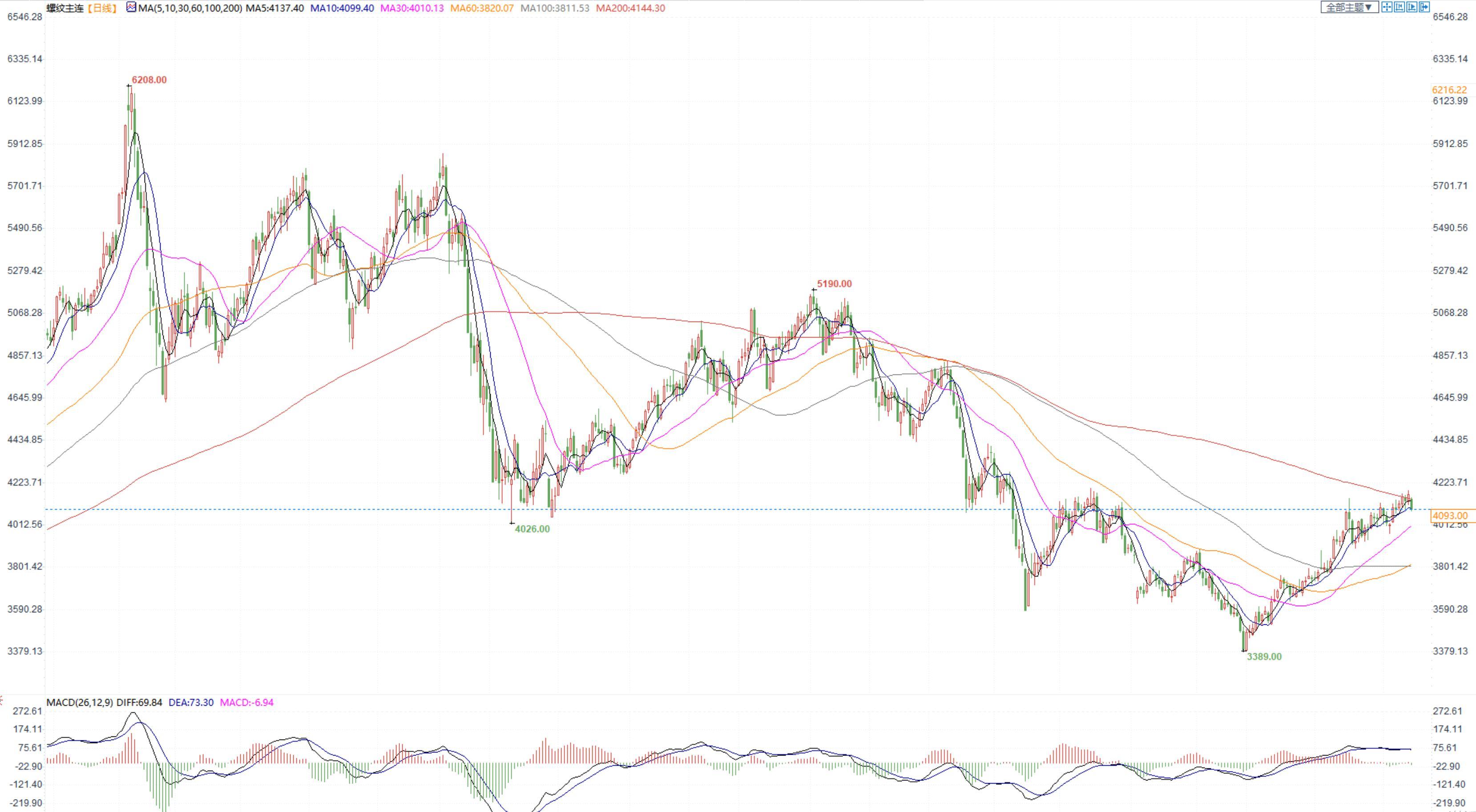 价格:受铁矿石价格监管影响,今日黑色系板块走弱。螺纹钢2305合约白天开盘后迅速下行,收盘价4093元/吨,收跌1.47%。现货价格持稳,上海中天现货价为4140元/吨。