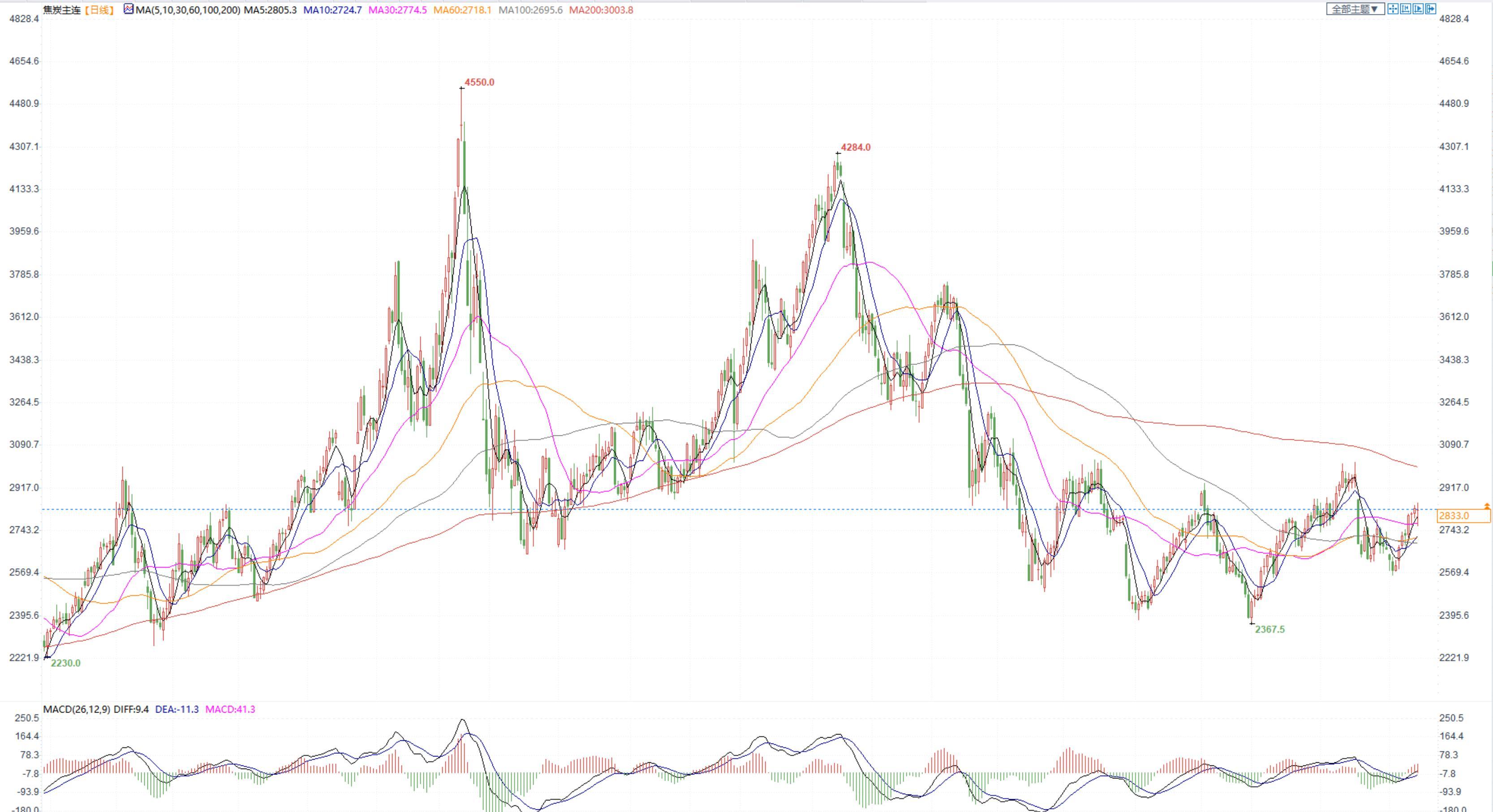 价格:今日05合约低开高走收于2833,在黑色系中表现最为强势,与回落较大的螺矿形成鲜明对比。港口准一级仓单成本。产地焦炭市场落实两轮降价后暂稳运行。