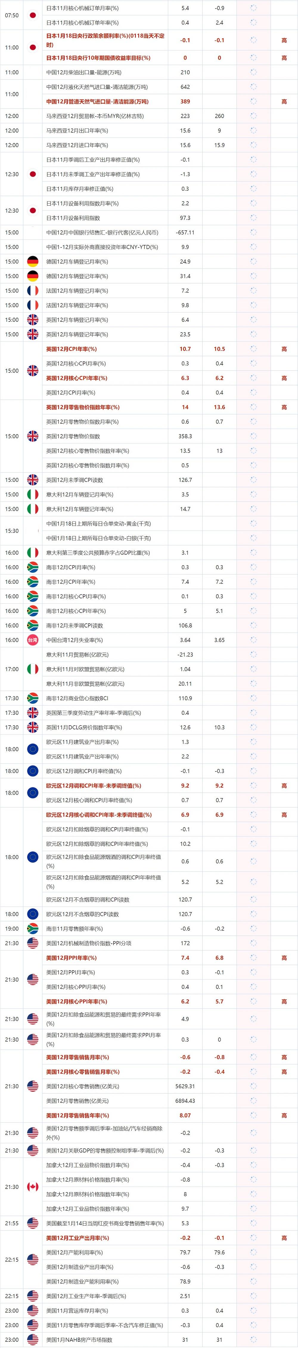 15:00 英国12月核心CPI年率(%) , 前值 6.3 , 预期值 6.2 , 公布值:待发布