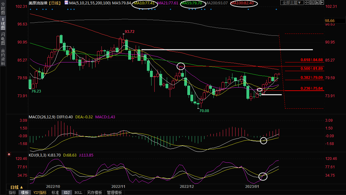 下方55日均线79.70位置已经转化为初步支撑所在,5日均线也在该位置附近,失守该位置前后市偏向多头;周一低点支撑在78.52附近,10日均线支撑在77.40附近,若失守该支撑,则增加短线看空信号。1月10日高点支撑在75.91附近,1月11日低点支撑在74.28附近。