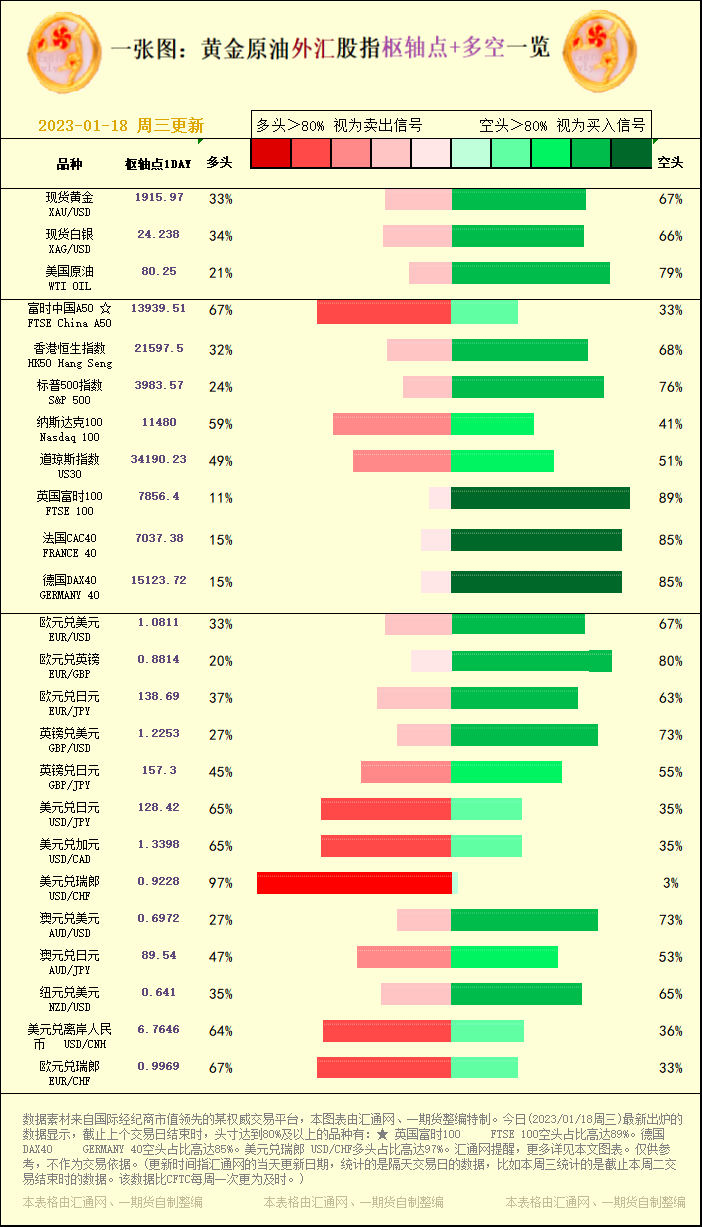 一张图:黄金原油外汇股指"枢纽点+多空占比"一览(2023/01/18周三)
