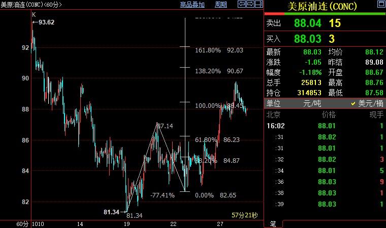 北京时间16:06,NYMEX原油期货下跌1.25%至87.97美元/桶;ICE布伦特原油期货下跌0.94%至94.15美元/桶。