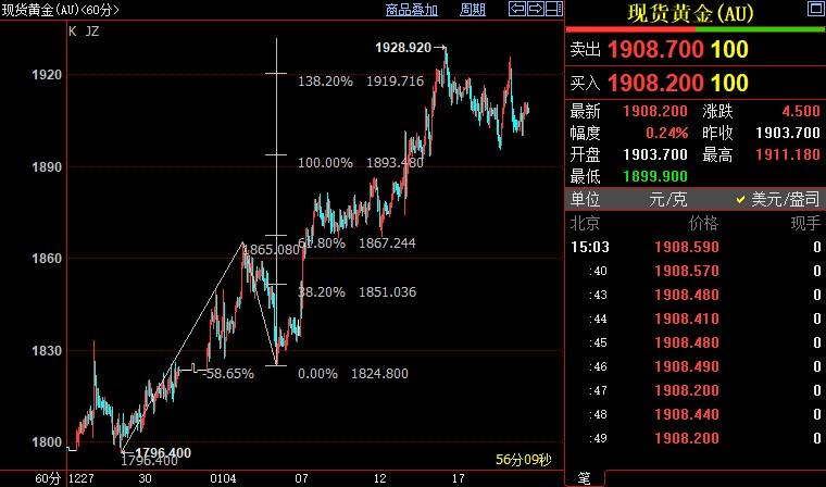 北京时间15:05,现货黄金上涨0.22%至1908.67美元/盎司;COMEX期金主力合约上涨0.18%至1910.4美元/盎司;美元指数下沉0.06%至102.333。