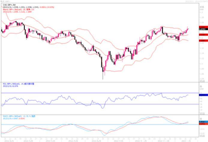 周三(1月187日)英镑兑美元英镑上涨约0.48%,收盘于1.2350,盘中最高曾触及1.2435。当日英国公布数据显示英国12月消费者物价指数(CPI)同比涨幅降至10.5%的三个月低点,但仍接近40年高位。其中服务业通胀上升以及食品和饮料价格加速上涨,让政策制定者感到有些担忧。荷兰国际集团(ING)分析师在报告中写道,“值得注意的是,服务业核心通胀率从6.4%跃升至6.8%,英国央行尤其应该考虑到这一点,再加上昨天的工资数据,应该会使央行倾向于在2月份加息50个基点。”目前市场认为,在将于2月2日举行的下一次会议上加息50个基点的可能性为82%。受该预期刺激,英镑兑美元多头近期跃跃欲试。昨日英镑已接近上个月触及的6个月高点1.2446美元,目前在日线图上维持在各短期均线上方,技术指标有开始上扬姿态;而4小时图显示有超买调整压力,下方初步支撑水平在1.2250附近(20期均线位置所在),进而在1.2160和1.2100附近。上方若能再次扫清1.24阻力障碍,目标可能瞄向上年5月份的高点1.2650附近。