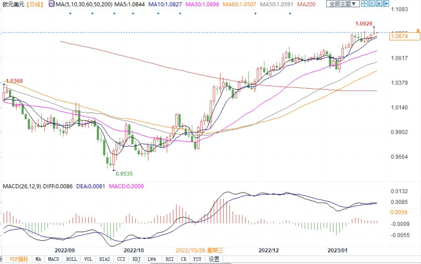 欧洲央行管理委员会官员诺特(Klaas Knot)上周日接受采访时表示,欧洲央行将在2月和3月加息50个基点,并将在接下来的几个月内继续加息。他还表示,放慢加息步伐的时间“还很遥远”。欧元兑美元闻讯上涨,周一一度触及九个月来最高水平1.0926。