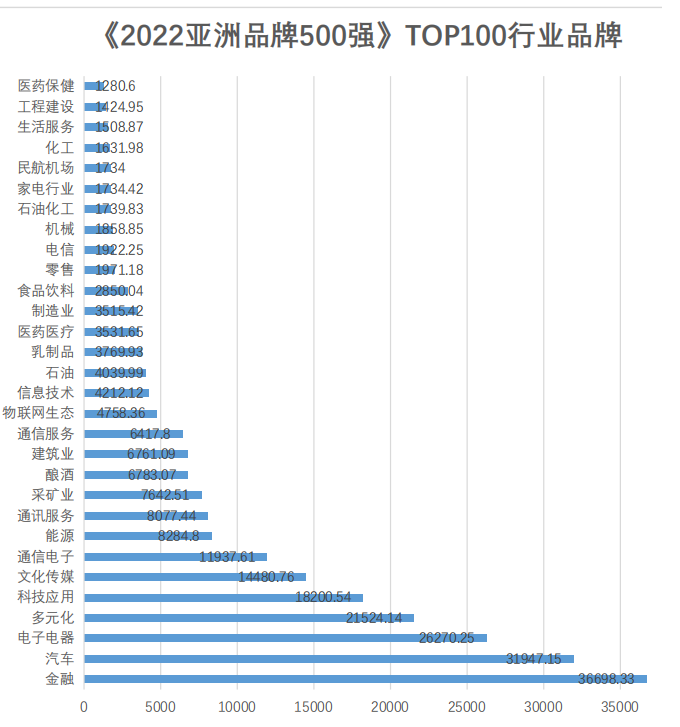 纵观此次《2022亚洲品牌500强 》, 上榜品牌共涉及91个细分行业,总价值量达到了490596.3亿人民币,整体榜单价值呈现增长趋势。从上榜品牌的数量来看,其中排名前十的行业分别为:金融行业58个,占比11.60%;文化传媒33个,占比6.60%;食品饮料、多元化、汽车、信息技术、电子电器、通信电子、制造业、 零售分别占比5.60%、5.00%、4.40%、4.00%、3.80%、3.40%、3.00%、2.60%。