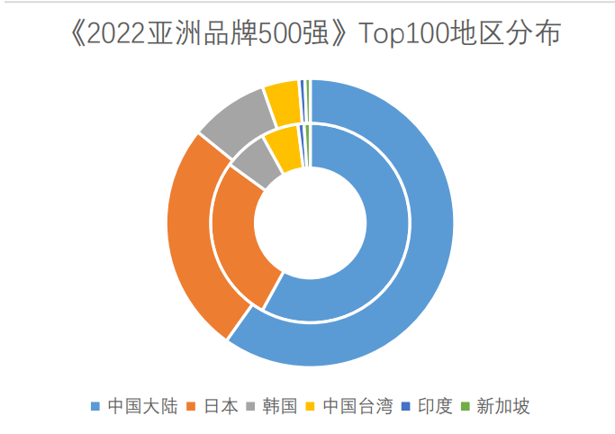 此次“2022 亚洲品牌 500 强”共有 17 个国家和地区的品牌入选。其中,中日两国优势明显,共计上榜 372 个品牌,占榜单席位总数的 74.4%。中国有 244 个品牌入选,排名第一,占榜单席位总数的 48.80%,其中中国大陆上榜品牌为 198 个,香港和台湾分别为 22 个和 24 个;日本有 128 个品牌入选,排名第二,占榜单席位总数的 25.60%;位居第三的是韩国,有 46 个品牌入选;其次是印度和新加坡,分别占据 32 个和 21 个席位;排名第六是泰国,占据榜单的 6 个席位。