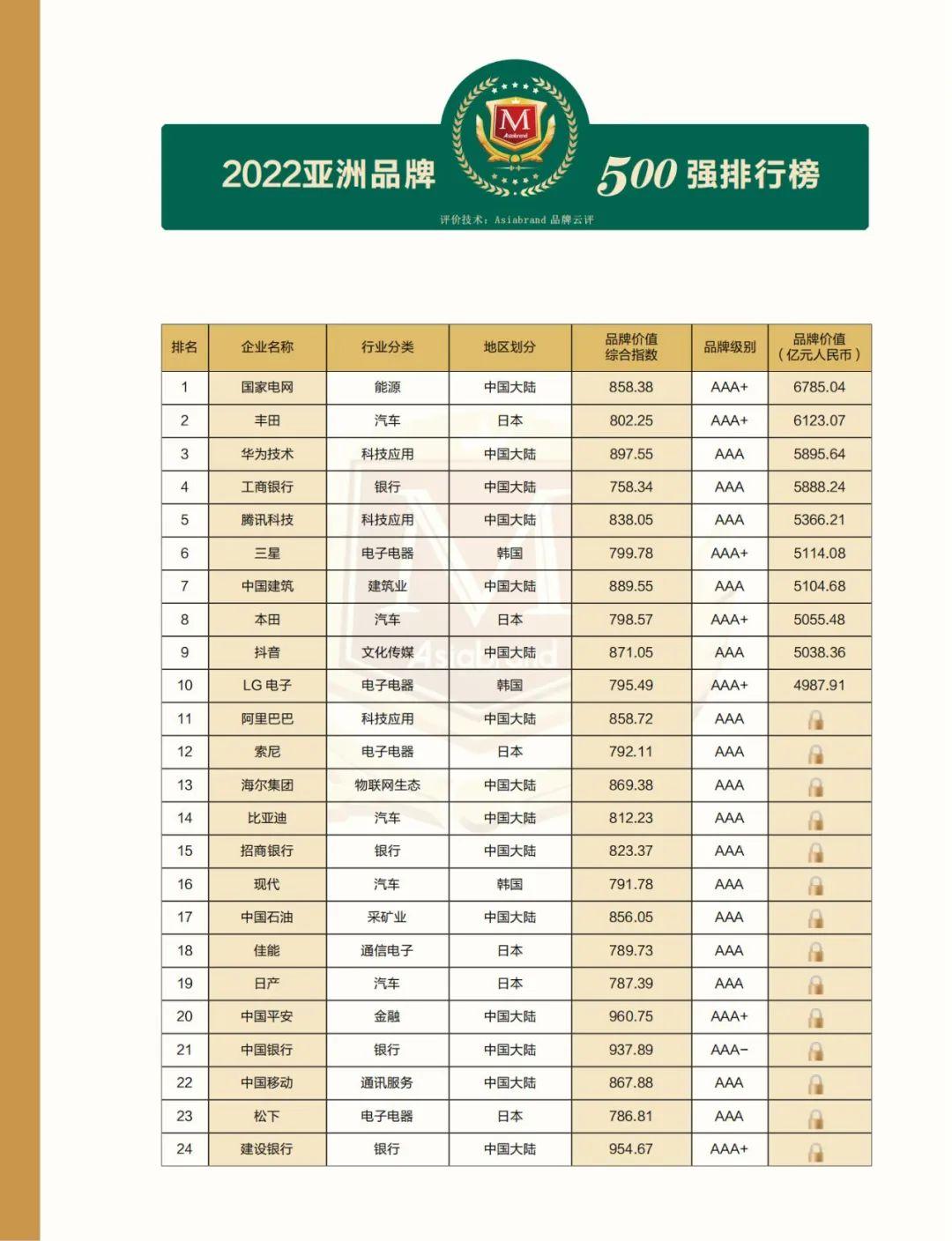 国家电网、丰田、华为、工商银行、腾 讯、三星、中国建筑、本田、抖音、LG电子荣登“2022亚洲品牌500强排行榜”TOP10。众多中国优秀民族品牌,本年度凭借更加优秀的品牌表现在榜单中取得了显著的价值坐标提升。