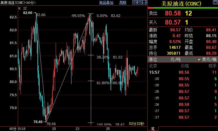 小时图上看,NYMEX原油仍处在自82.62美元开启下行c浪走势,若不能站上38.2%目标位81.02美元,油价或重回61.8%目标位80.02美元下方。c浪是自82.66美元开启的调整(ii)浪的子浪。