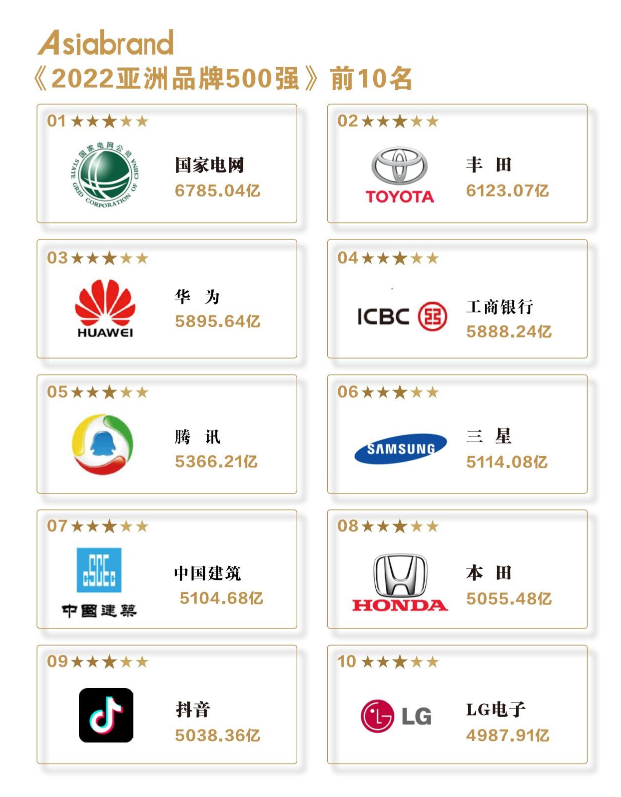亚洲品牌研究院院长、中国品牌管理研究中心主席王汉武隆重发布了“2022亚洲品牌500强”并对榜单作了分析报告。国家电网、丰田、华为、工商银行、腾讯、三星、中国建筑、本田、抖音、LG电子位列“2022亚洲品牌500强”TOP10。