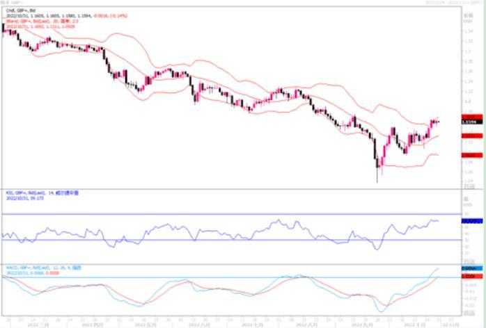 上周五(10月28日)欧元兑美元下跌0.1%,至0.9955美元。之前欧洲央行一如预期加息75个基点,但对利率前景采取了更加鸽派的基调,导致欧元出现冲高回落。德国数据在一定程度上支撑了欧元,该数据显示欧洲最大经济体在第三季度意外避免了衰退,而在与俄罗斯的痛苦能源对峙的推动下,通胀率意外攀升。但上周基调更加鸽派的欧洲央行,以及加拿大央行当周加息幅度小于预期,或有助于推动对美联储转向的预期。一旦本周美联储在利率会议上透露对此后加息不那么坚定的信息流出的话,或会削弱美元的强势。日图录得乌云盖顶组合重新跌回1.000下方,但下方均线仍提供支持,暂时看震荡。4小时图有所回落,但仍未破坏整体反弹势头。小时图震荡下行,回踩0.9950附近水平企稳。若0.9950-0.9900区域不失守,则欧元存在保持反弹态势的可能性。