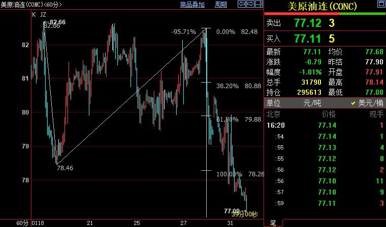 北京时间16:26,NYMEX原油期货下跌0.96%至77.15美元/桶;ICE布伦特原油期货下跌0.85%至83.78美元/桶。两市分别创1月11日以来新低至77.08美元/桶和1月13日以来新低至83.67美元/桶。