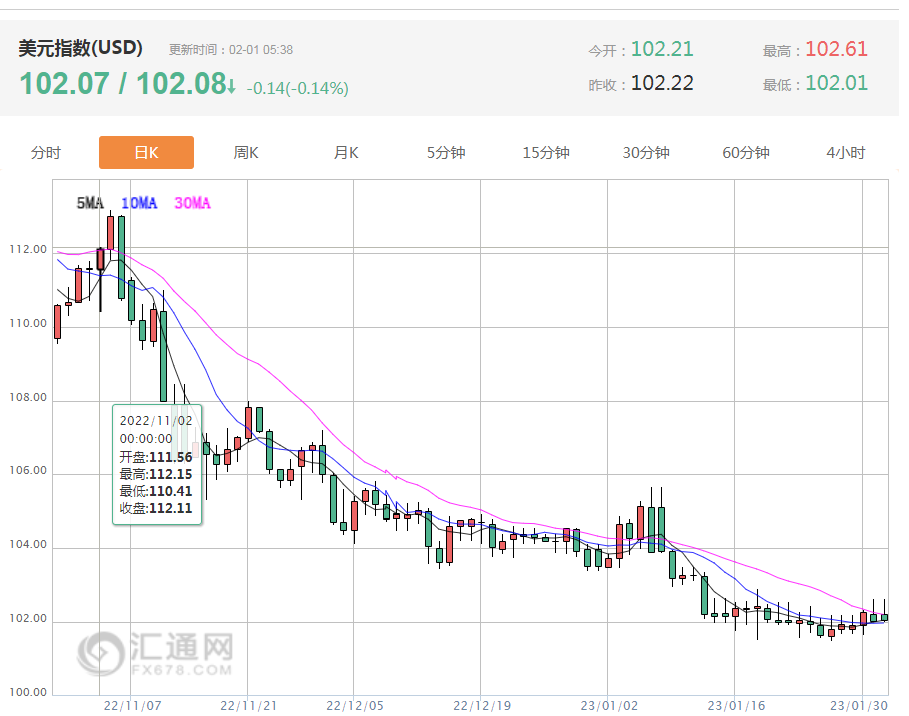 美元指数转跌,此前美国数据显示,由于薪资增长放缓,美国第四季度劳动力成本升幅为一年来最小,这增强了美联储放缓加息的预期。投资者预计美联储将在周三加息25个基点,英国央行和欧洲央行料在周四加息50个基点。