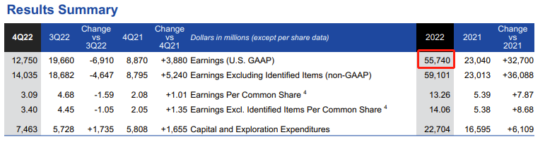 全年来看,公司在2022年实现了557.40亿美元的利润,是2021年230.40亿美元的2.4倍。这还意味着,埃克森美孚在去年每小时平均能赚约630万美元。
