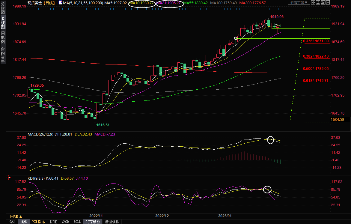 上周五低点支撑在1916.56附近,21日均线支撑目前在1906.22附近,重点关注1900整数关口附近支撑,如果失守该支撑,则增加短线见顶信号。