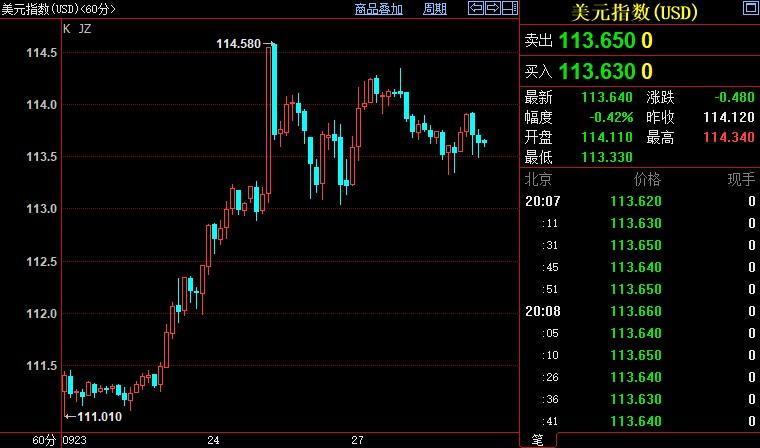 北京时间20:08,现货黄金上涨0.90%至1636.77美元/盎司;COMEX期金主力合约上涨0.69%至1644.7美元/盎司;美元指数下跌0.42%至113.641。