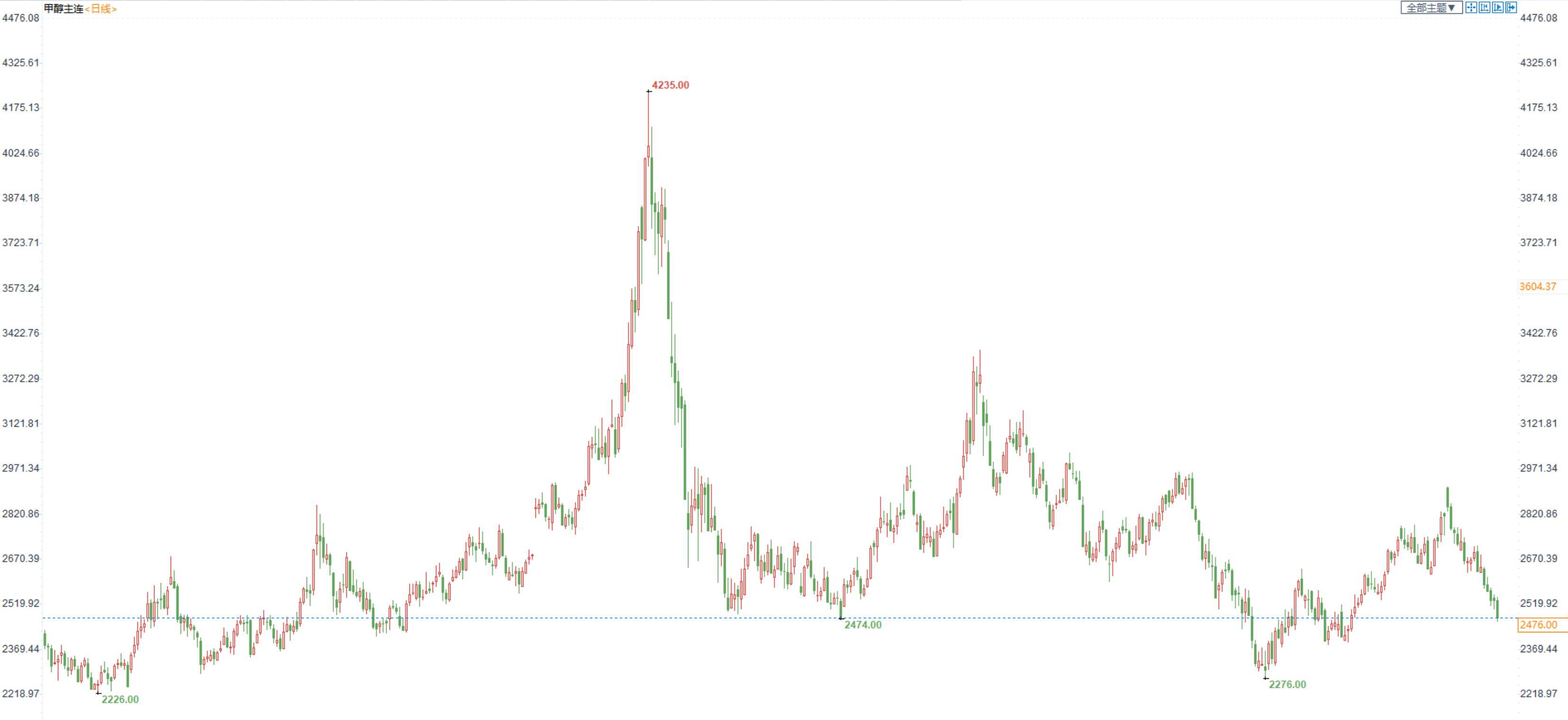 期货市场,甲醇2301合约跌超2%,收盘价2476。江苏现货报价2810-2820,现货在低库存支撑下,强势于期货价格。