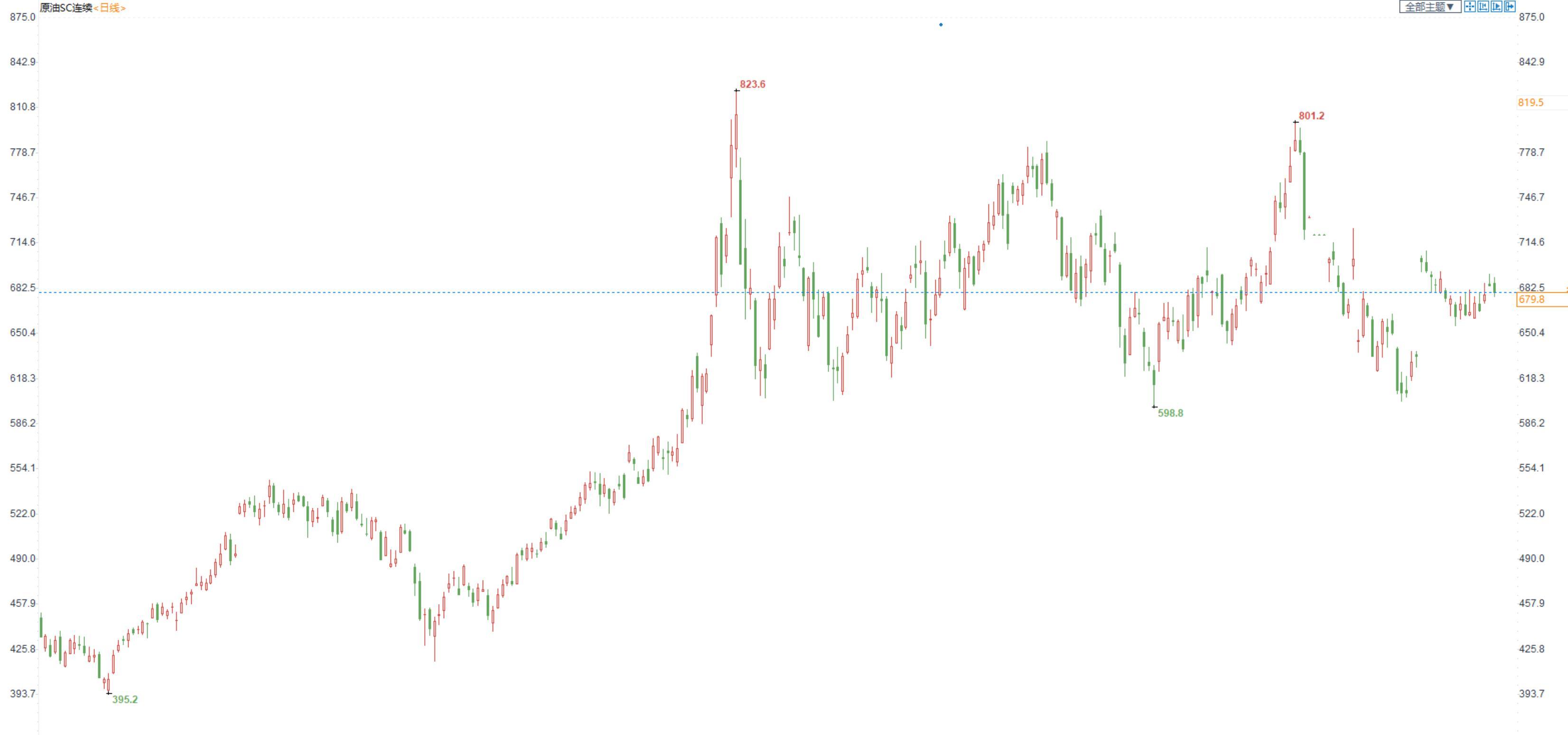 期货市场,布油在92美元附近震荡整理,国内SC2212合约小幅收跌,收盘价679.8。