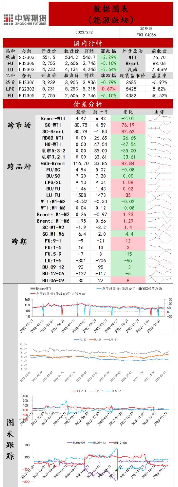 消息面:供需:OPEC维持产能政策不变,下次联合部长级监督委员会(JMMC)会议将在4月3日召开;据伊拉克石油部数据显示,伊拉克一月原油出口量为101.20万桶/日。宏观经济:美联储加息25个基点,预计加息还会继续持续;美国1月PMI指数为47.4,连续第3个月萎缩,有较大经济衰退风险。