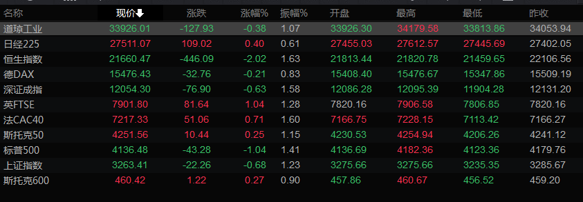 美股收盘情况:道琼斯工业指数下跌0.38%,至33926.01点;标普500指数下跌1.04%,至4136.48点;纳斯达克指数下跌1.59%,至12006.96点。