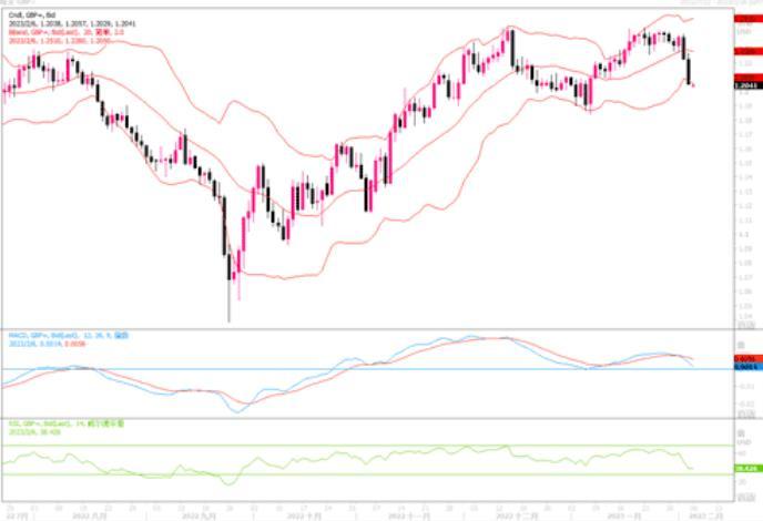 英镑兑美元上周五(2月3日)急挫1.42%收盘于1.2050。英镑的大幅回软,也是因为此前美国公布的1月非农就业岗位增幅远超预期,推动了对美联储下个月可能选择更大规模加息幅度的押注,从而给英镑带来的巨大的下行压力。虽然上周四英国央行继续加息50个基点,但随之英国央行表示,通胀可能已经“出现转折”,这给到投资者的感觉是英国央行可能即将结束其紧缩周期。外汇市场上,投资者也是借此进行获利回吐的交易而抛售英镑。此外,英国央行表示,英国与欧盟贸易下滑对经济造成的损害,较官方数据所反映的更为严重。英国央行上周四对未来几年的经济增长前景给出了悲观预测,脱欧负面影响提前到来是主要原因之一。宏观面的不利料将压制英镑的表现。技术图形上,英镑兑美元跌穿布林带中轨且压向下轨,显示极重的回撤下落走势,下方关键的支撑留意1.20整数关口,若继续跌穿,下行幅度将进一步加大。