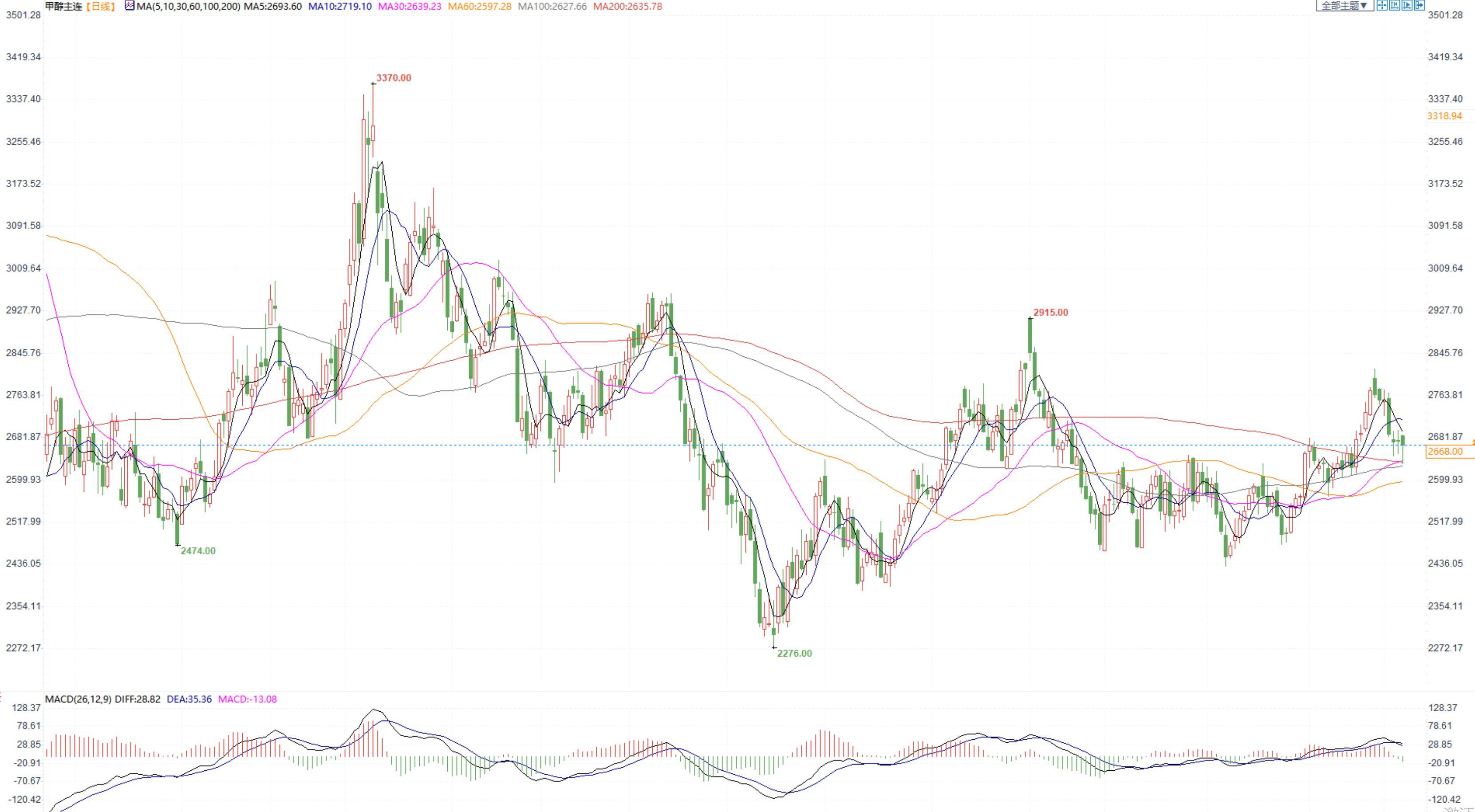 期货市场,甲醇2305合约小幅收跌,收盘价2668,关注20日均线附近的支撑情况。张家港地区参考价格2740-2760元/吨附近现汇出罐。