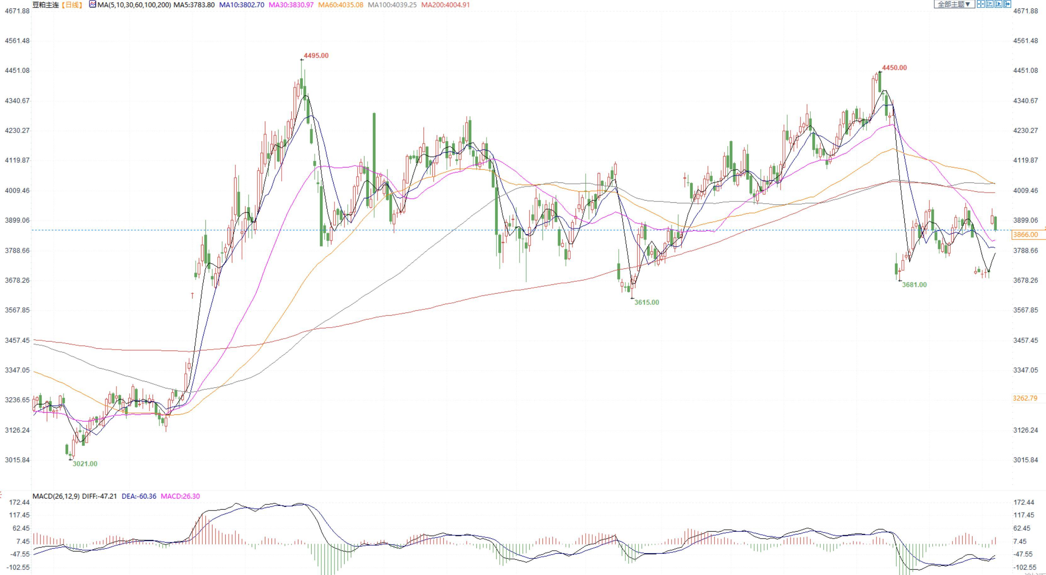豆粕2305合约日内跌1.30%,收盘价3867元/吨,张家港市场豆粕4560元/吨。
