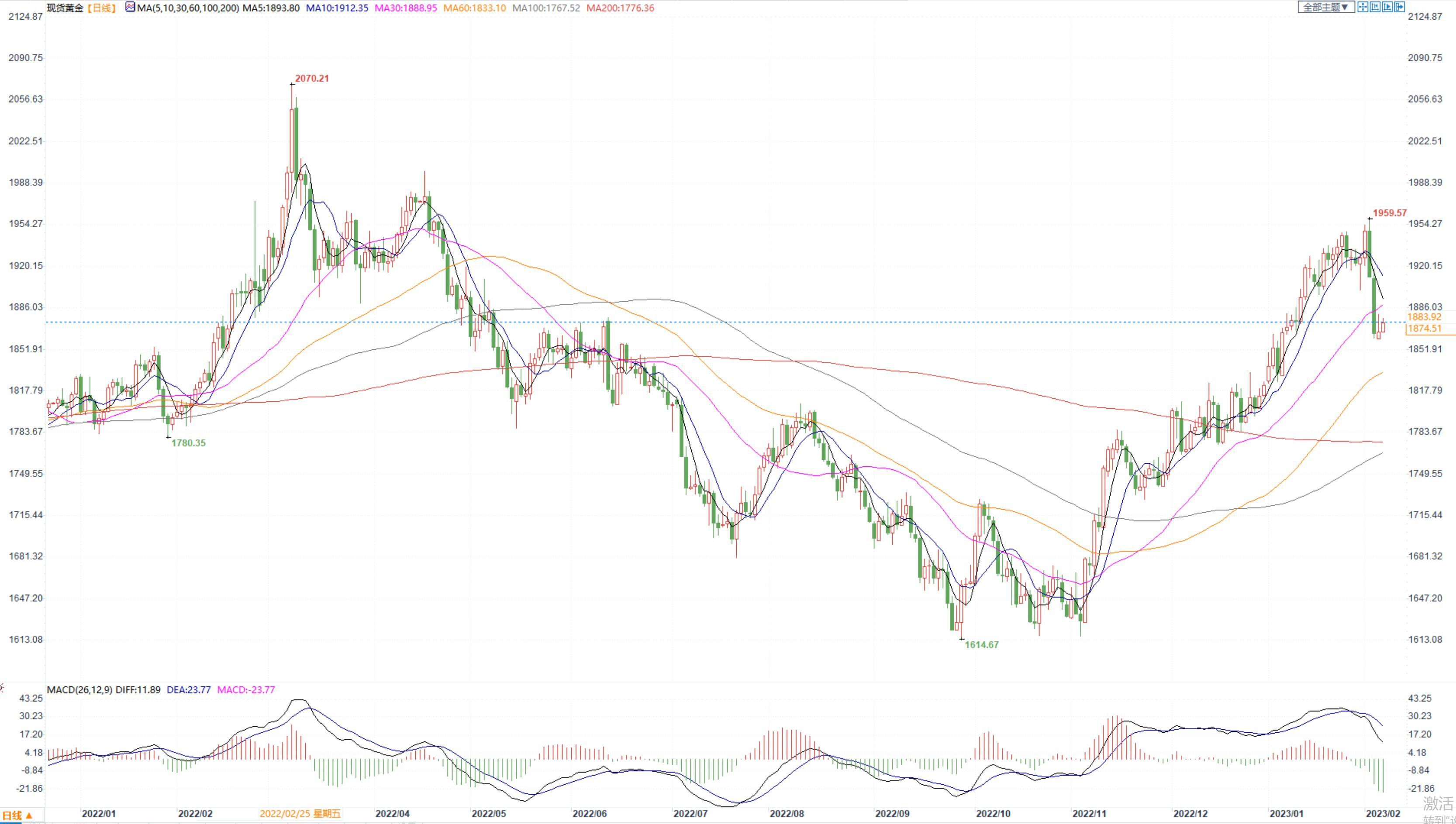 【今日行情】金银全线收跌。AU2304收盘价为412.62,收跌0.50%;AG2306收盘价为5008,收跌1.42%。隔夜美元指数继续反弹,连续第三个交易收涨,今日日内表现也较为抗跌,十年期美债收益率反弹至3.6%,短期对金银支撑减弱。