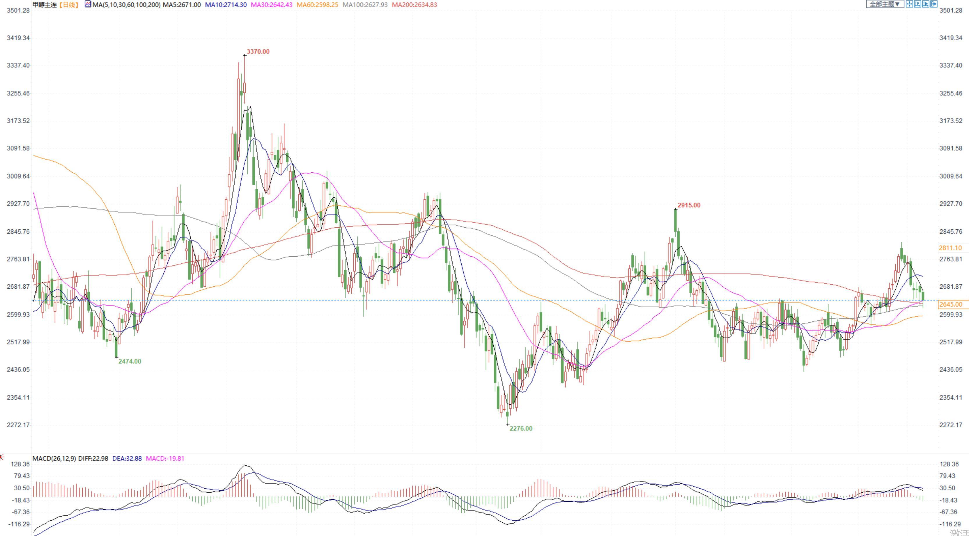 期货市场,甲醇2305合约小幅收跌,收盘价2645,关注40日均线附近的支撑情况。张家港地区参考价格2700-2710元/吨附近现汇出罐。