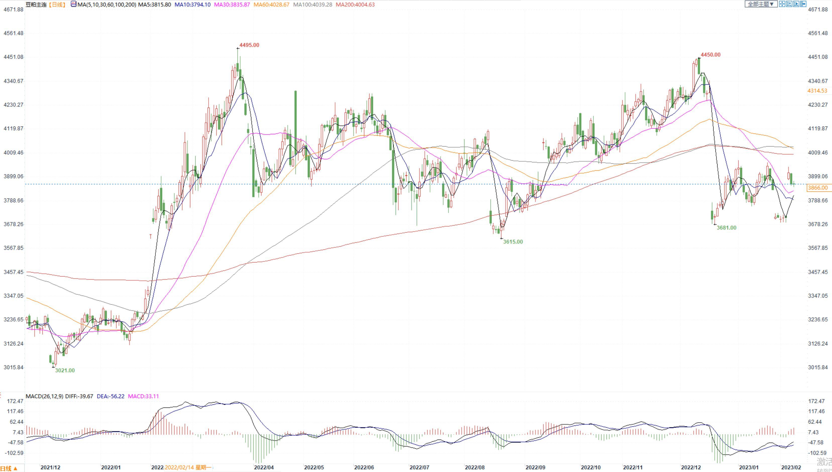 豆粕2305合约日内跌0.36%,收盘价3866元/吨,张家港市场豆粕4560元/吨。