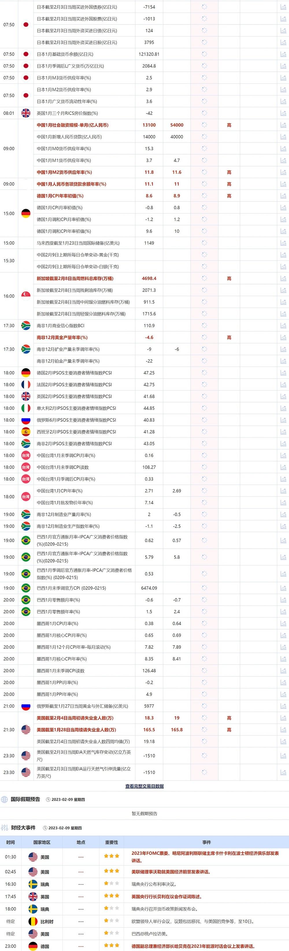 2月9日,投资者需要关注的重点数据:中国1月社会融资规模-单月,中国1月M2货币供应年率,中国1月人民币各项贷款余额年率,德国1月CPI年率初值,新加坡截至2月8日当周燃料总库存,南非12月黄金产量年率,美国截至2月4日当周初请失业金人数和