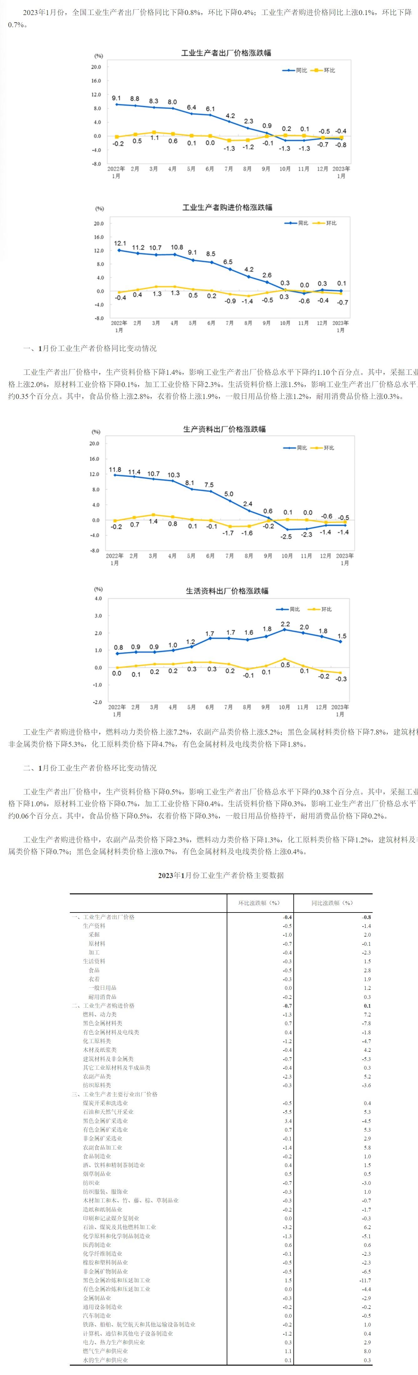 2023年1月份工业生产者出厂价格同比下降0.8% 环比下降0.4%