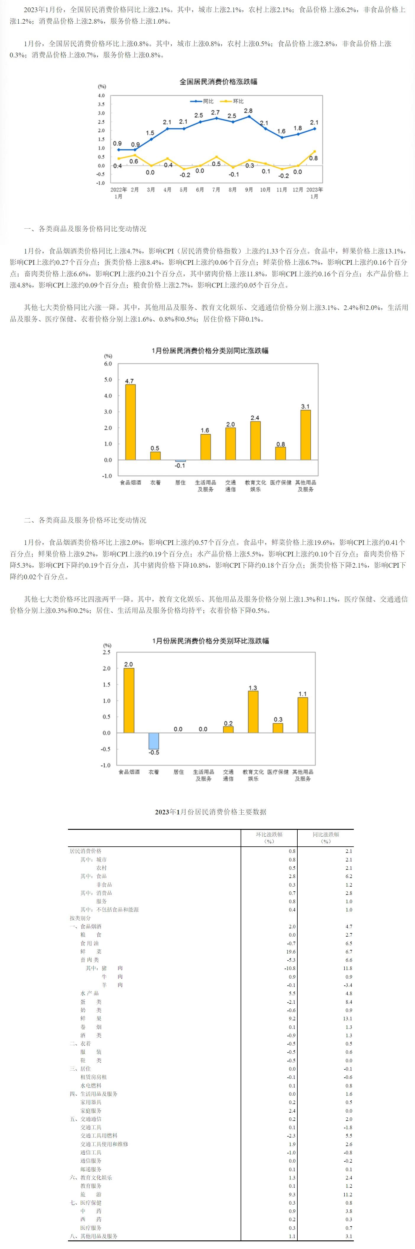 2023年1月份居民消费价格同比上涨2.1% 环比上涨0.8%