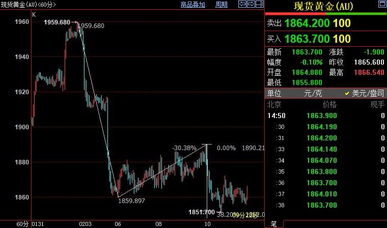 北京时间14:57,现货黄金下跌0.10%至1863.19美元/盎司;COMEX期金主力合约下跌0.02%至1874.2美元/盎司;美元指数上涨0.12%至103.691。