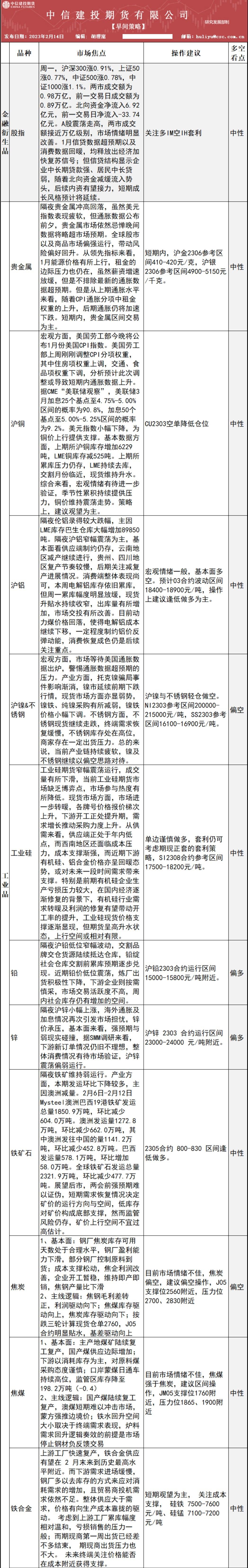 中信建投期货2月14日早间交易策略