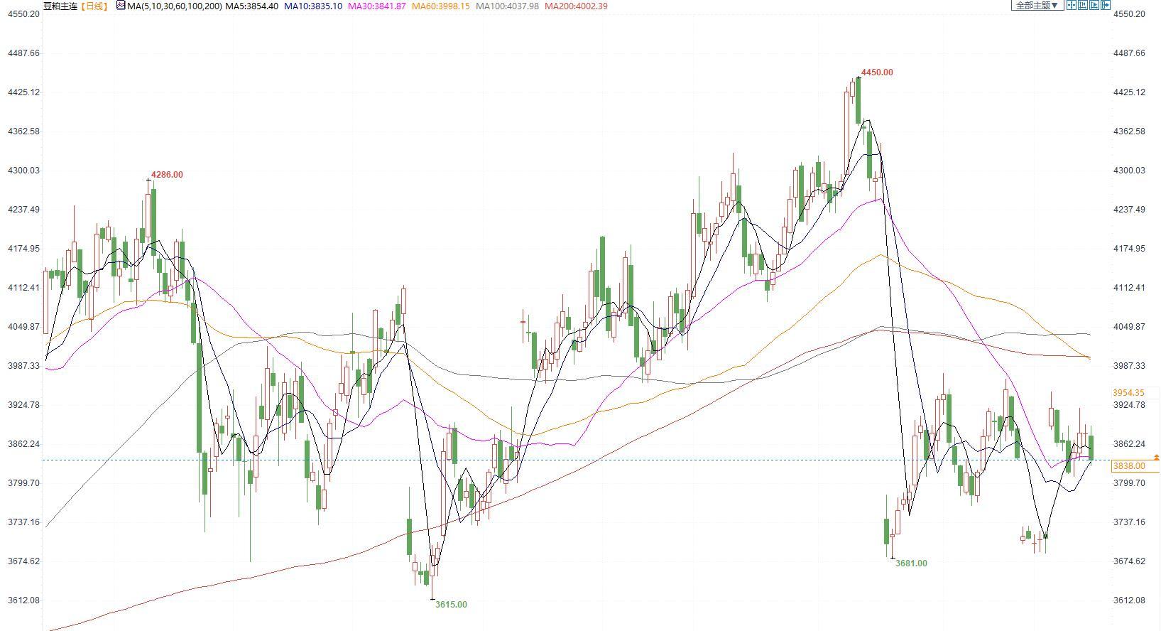 豆粕2305合约日内跌0.95%,收盘价3838元/吨,张家港市场豆粕4515元/吨。