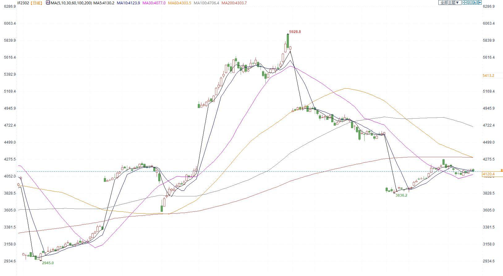 【今日涨跌】四大期指涨跌互现。IH2302收盘价为2752.8,收跌0.75%;IF2302收盘价为4120.4,收跌0.48%;IC2302收盘价为6379.0,收跌0.11%;IM2302收盘价为7049.8,收涨0.10%。