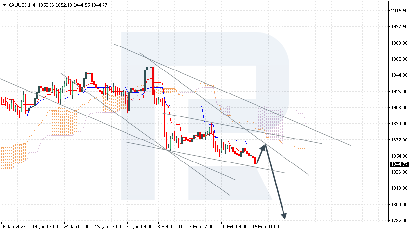 金价正在一个下降通道内走低。价格位于一目均衡图下方,表明处于下跌趋势中。金价跌破云图基准线1870美元之后将下探1785美元。确认跌势的进一步信号将是自看跌通道的上边界回落。若突破云图的上边界并维持在1920美元上方该情形将失效,这意味着金价将进一步上涨至1955美元。